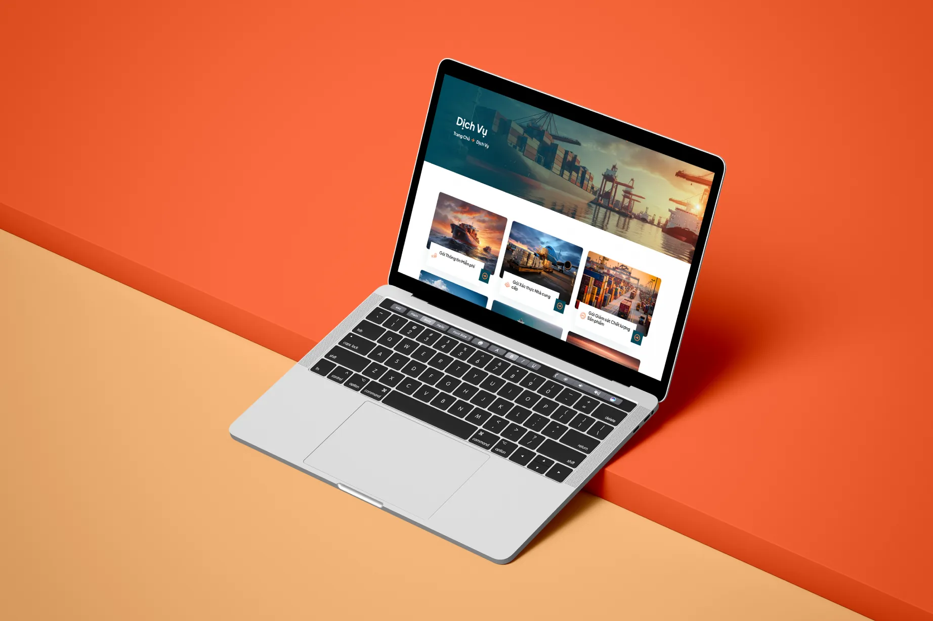 - Thiết kế định hướng toàn cầu: Giao diện xây dựng chuyên nghiệp với bố cục rõ ràng, thể hiện tính quốc tế thông qua ngôn ngữ tiếng Anh và hình ảnh phản ánh vị thế chiến lược của Việt Nam trên các tuyến vận chuyển hàng hải toàn cầu, tạo ấn tượng đáng tin cậy với đối tác quốc tế.
