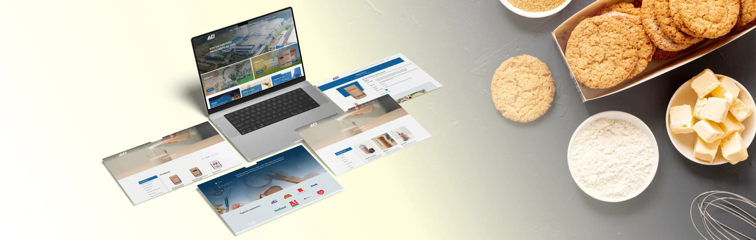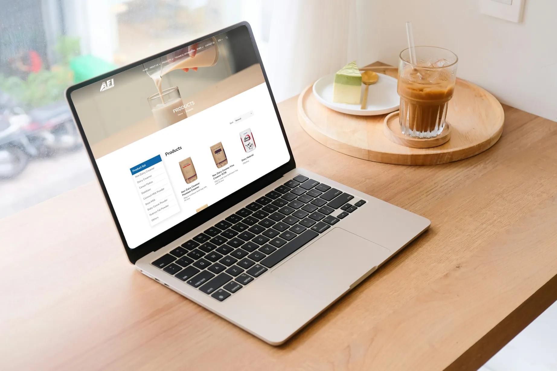 Vibrant Design – Asserting Excellence: AFI’s website interface stands out with elegant white tones and refined blue, combined with smooth scrolling effects displaying real images of production lines and products like non-dairy creamer powder, creating a professional and trustworthy impression. Categories such as “Products” and “About Us” are scientifically arranged, integrating quick product search tools, helping customers explore easily.