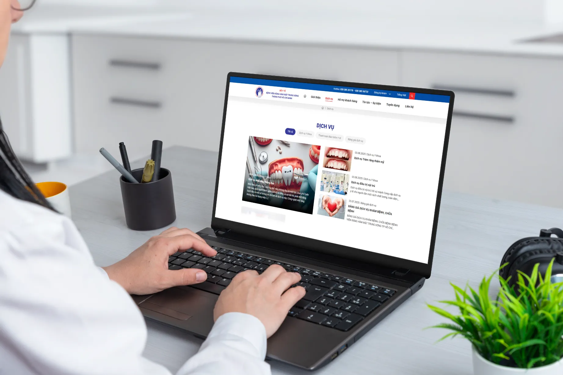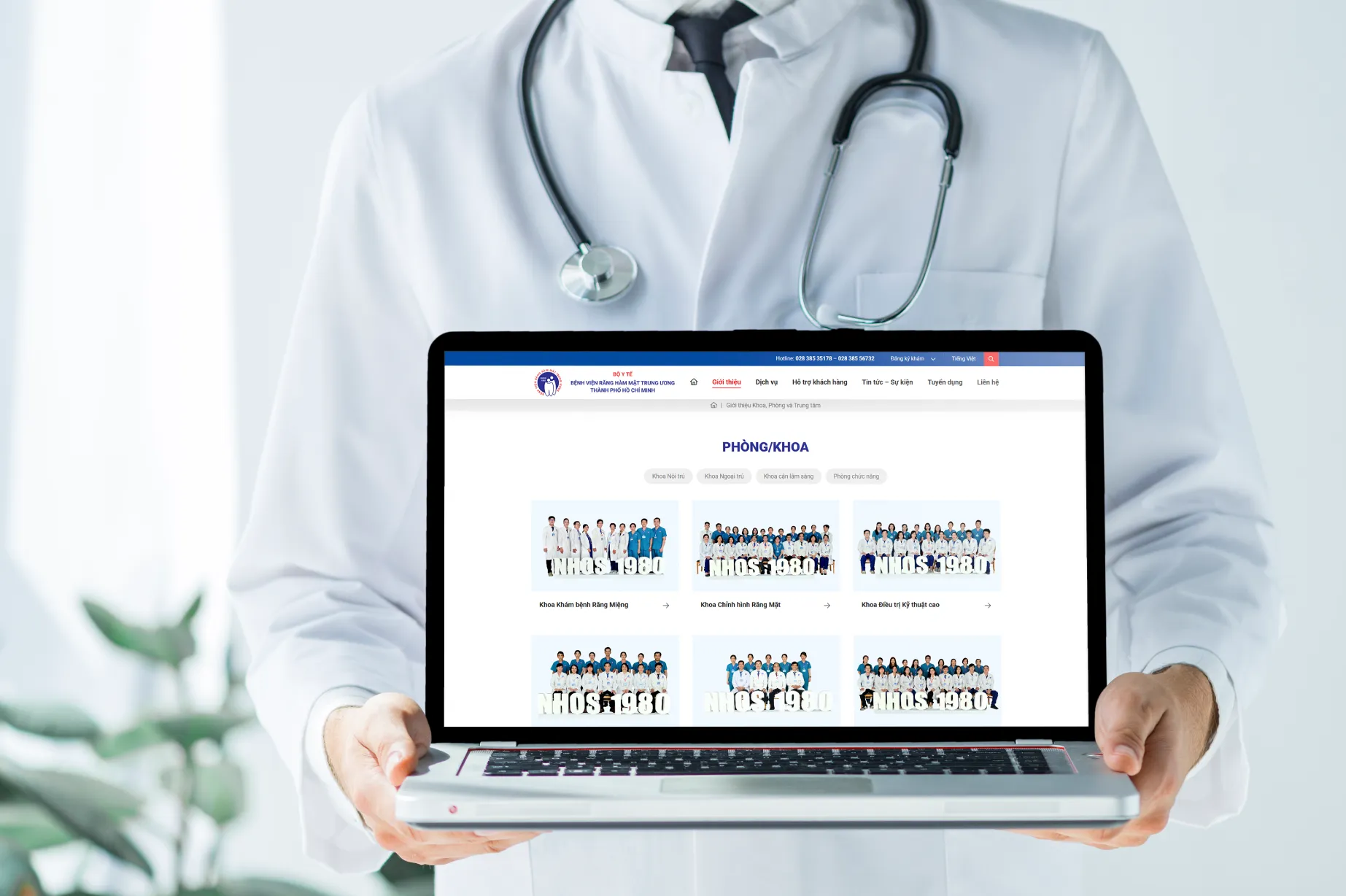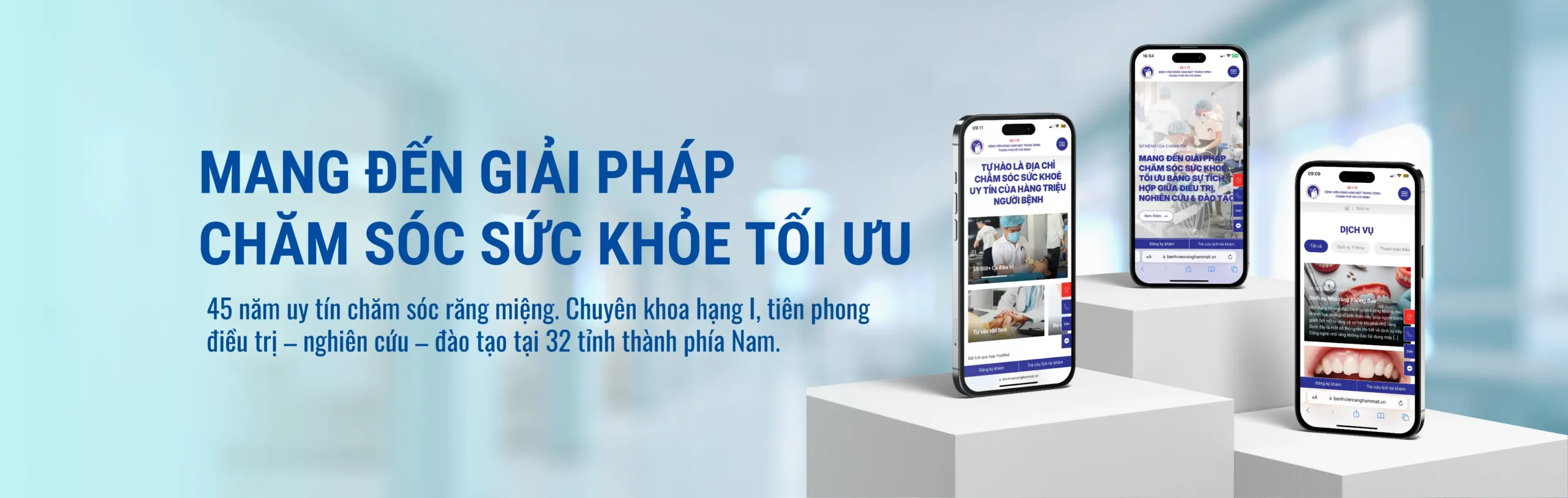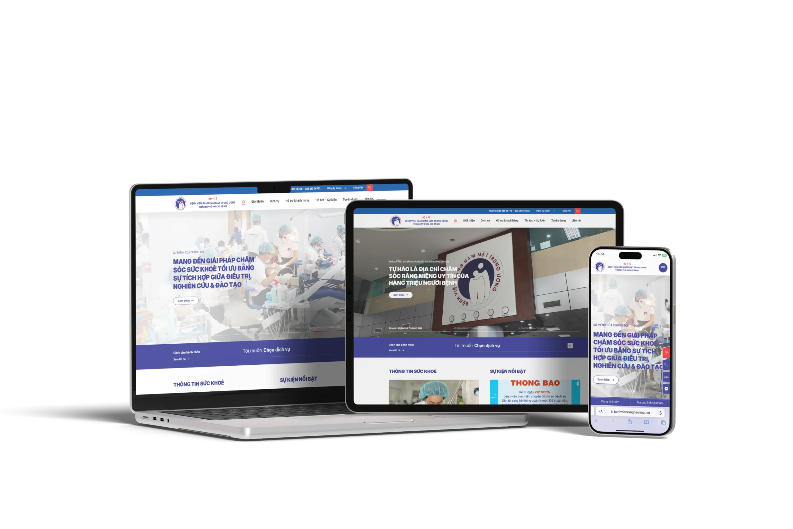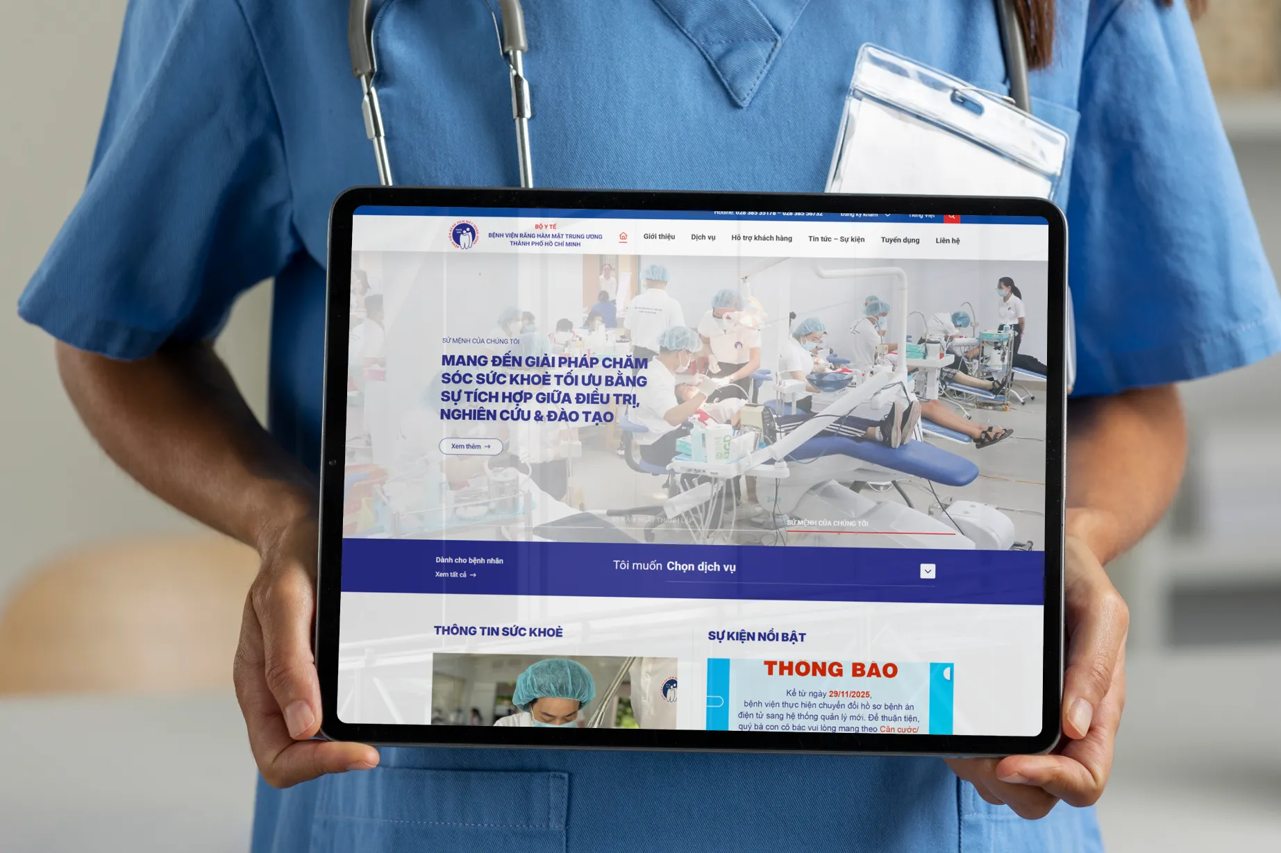 The hospital desired a web platform that reflects its leading position in the dental and maxillofacial specialty, providing comprehensive information about the medical team, departments/clinics/centers, medical services, healthcare network guidance programs – training – research. Additionally, it needed to be convenient for patients to search information, register for appointments, check follow-up schedules, understand medical examination procedures, and access customer service activities.